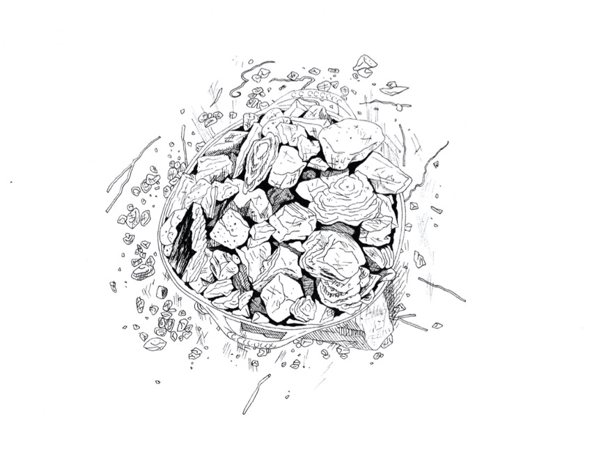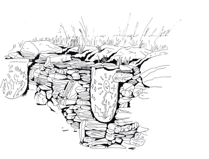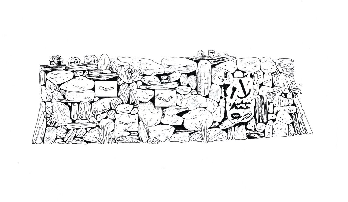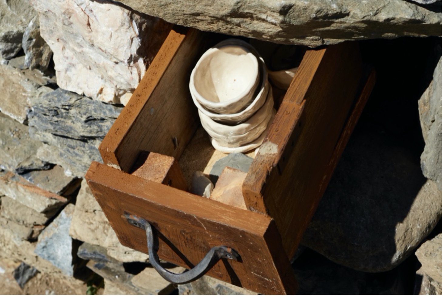 Comme un vigile, il est resté debout puis s’est détruit, puis on l’a reconstruit avec tous ses souvenirs, il est devenu le « Muret à tiroirs. » Il s’est transformé pour les habitants en un « meuble » avec ses petits tiroirs, avec à l’intérieur les objets en terre à découvrir ou redécouvrir, dont on s’émerveille… que l’on déplace d’un tiroir à l’autre...