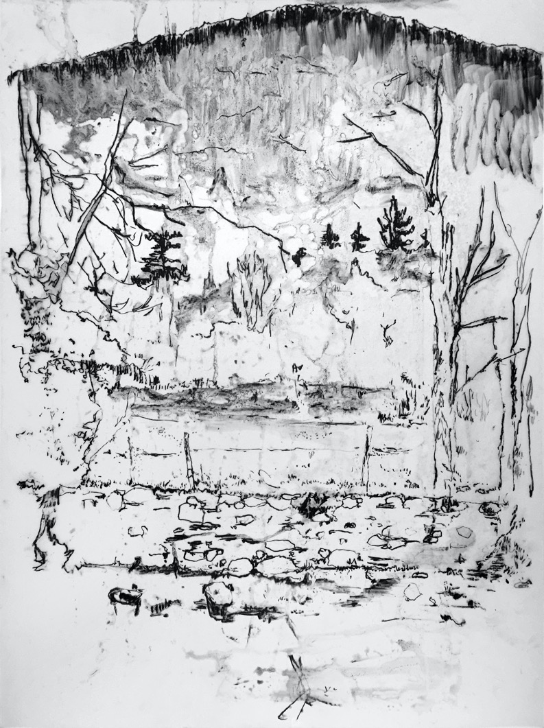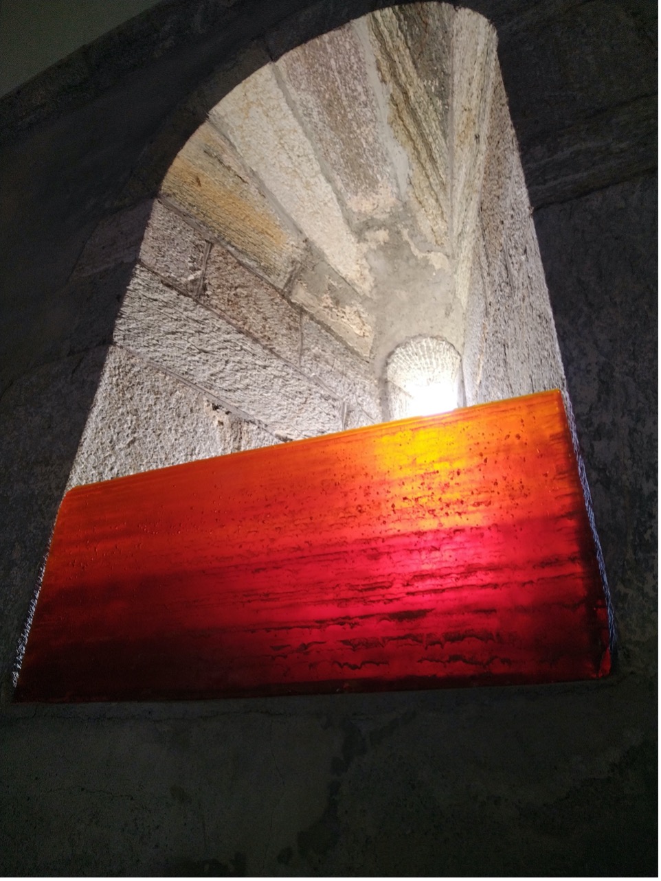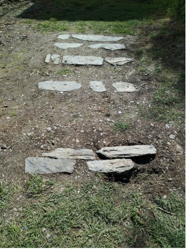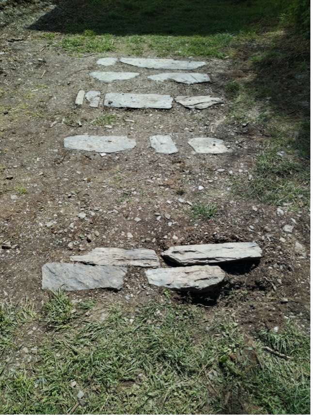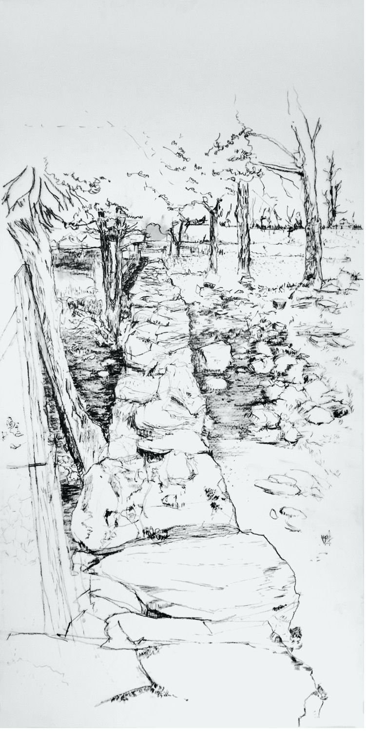 En dialogue avec la reconstruction artistique du muret en pierre sèche réalisée par Sandrine et Javier l’intervention au sol d’Helena Heras réunit ou étale la matière, selon le sens de la marche. Tel un pavé intermittent, la disposition des pierres suit une logique d’espacement dont la distance se dédouble, s’écartant au fur et à mesure que l’on s’éloigne des murets, donnant à la piêce un sens fonctionnel, nous dit Helena.