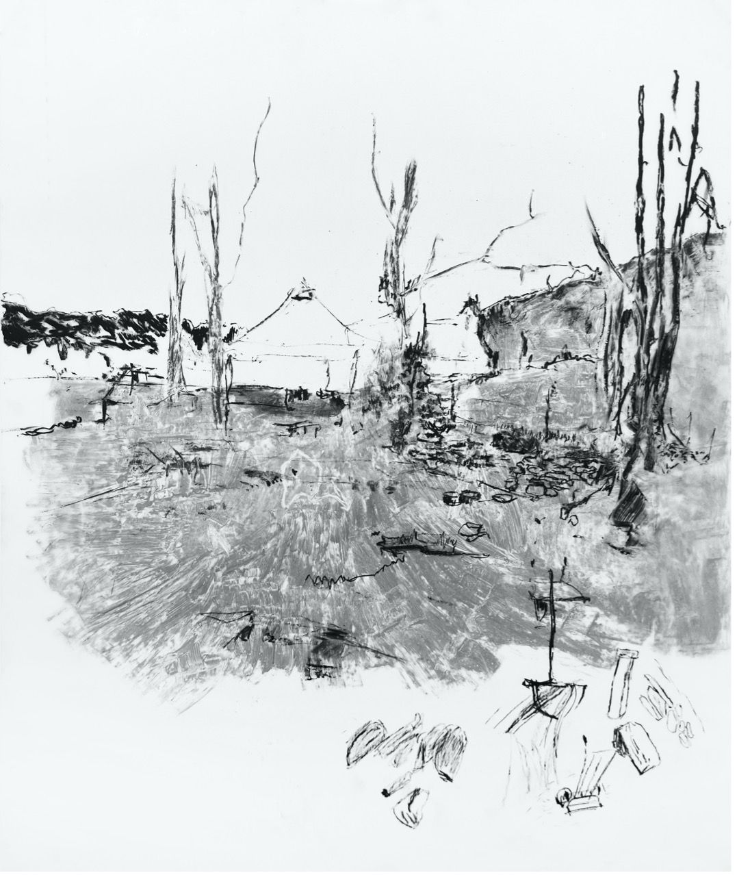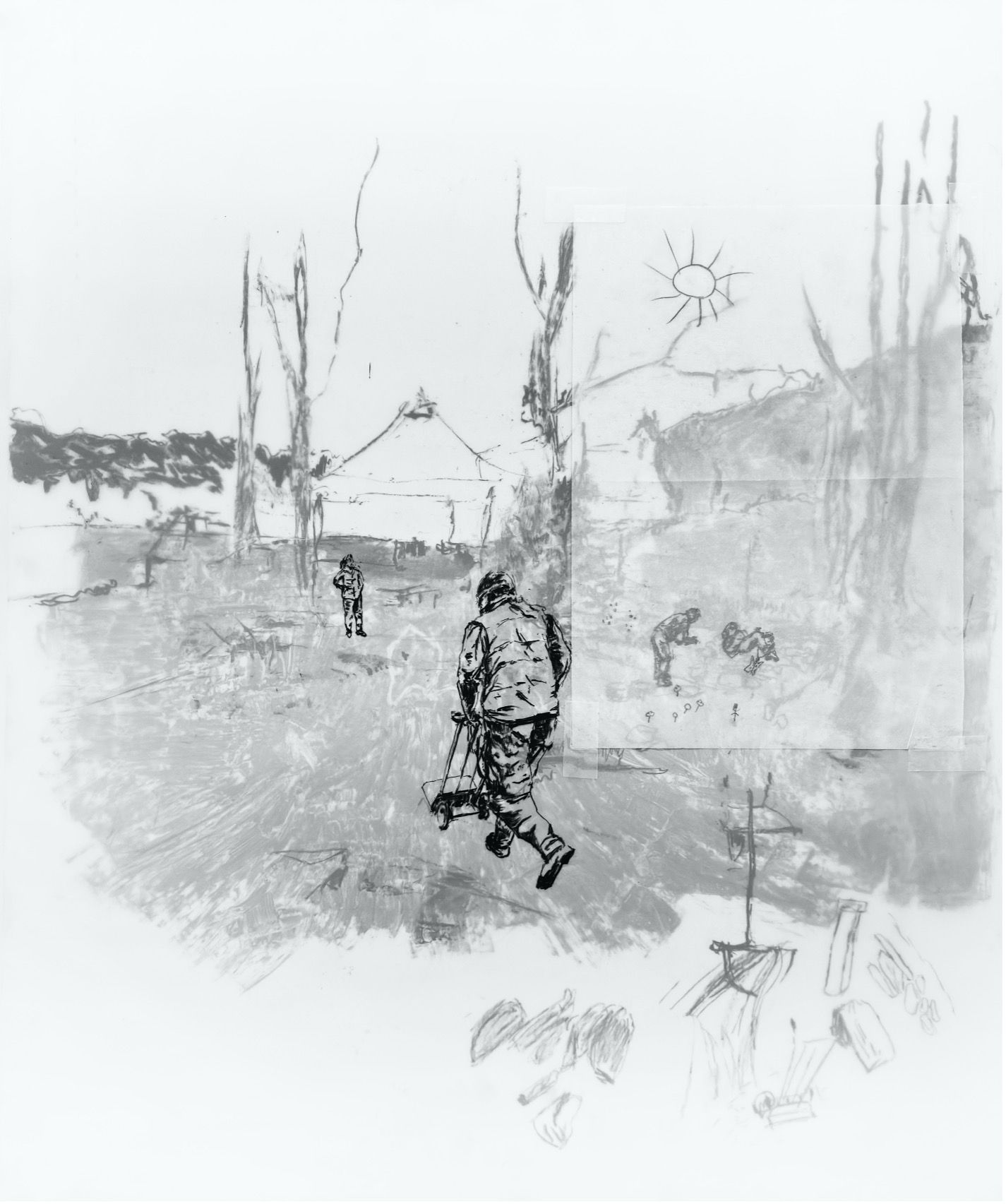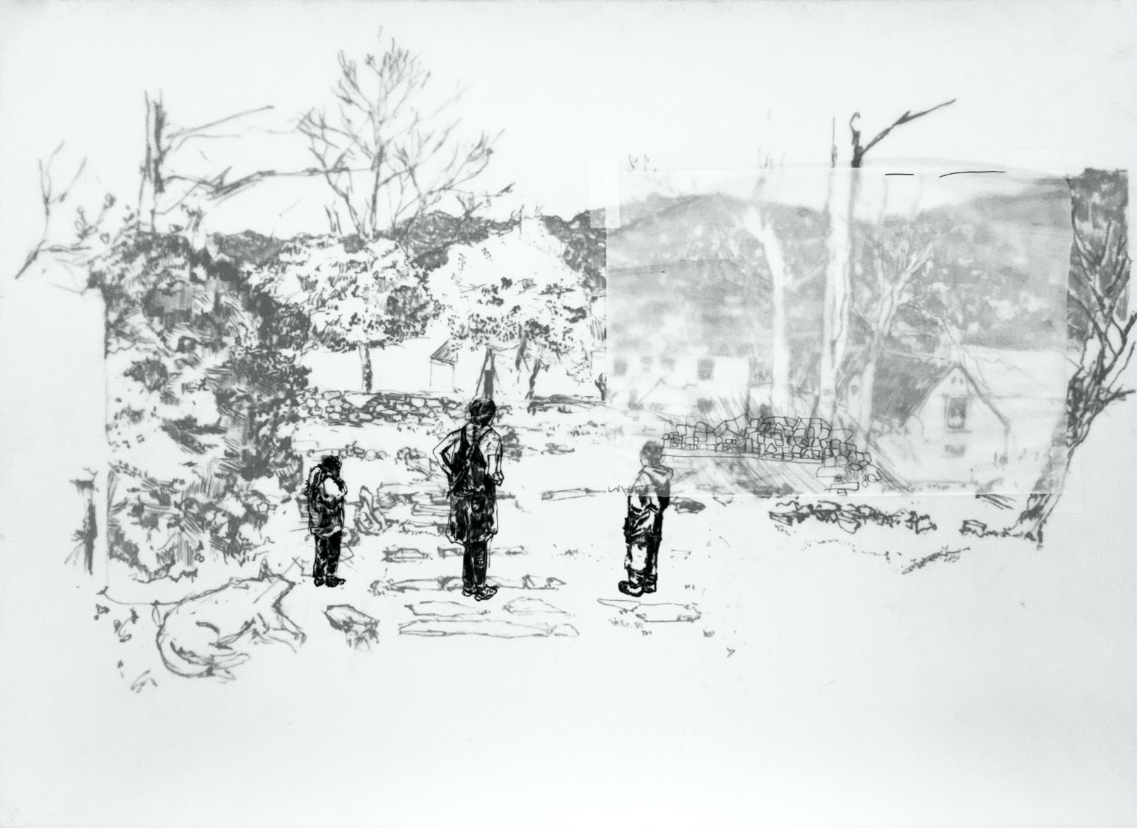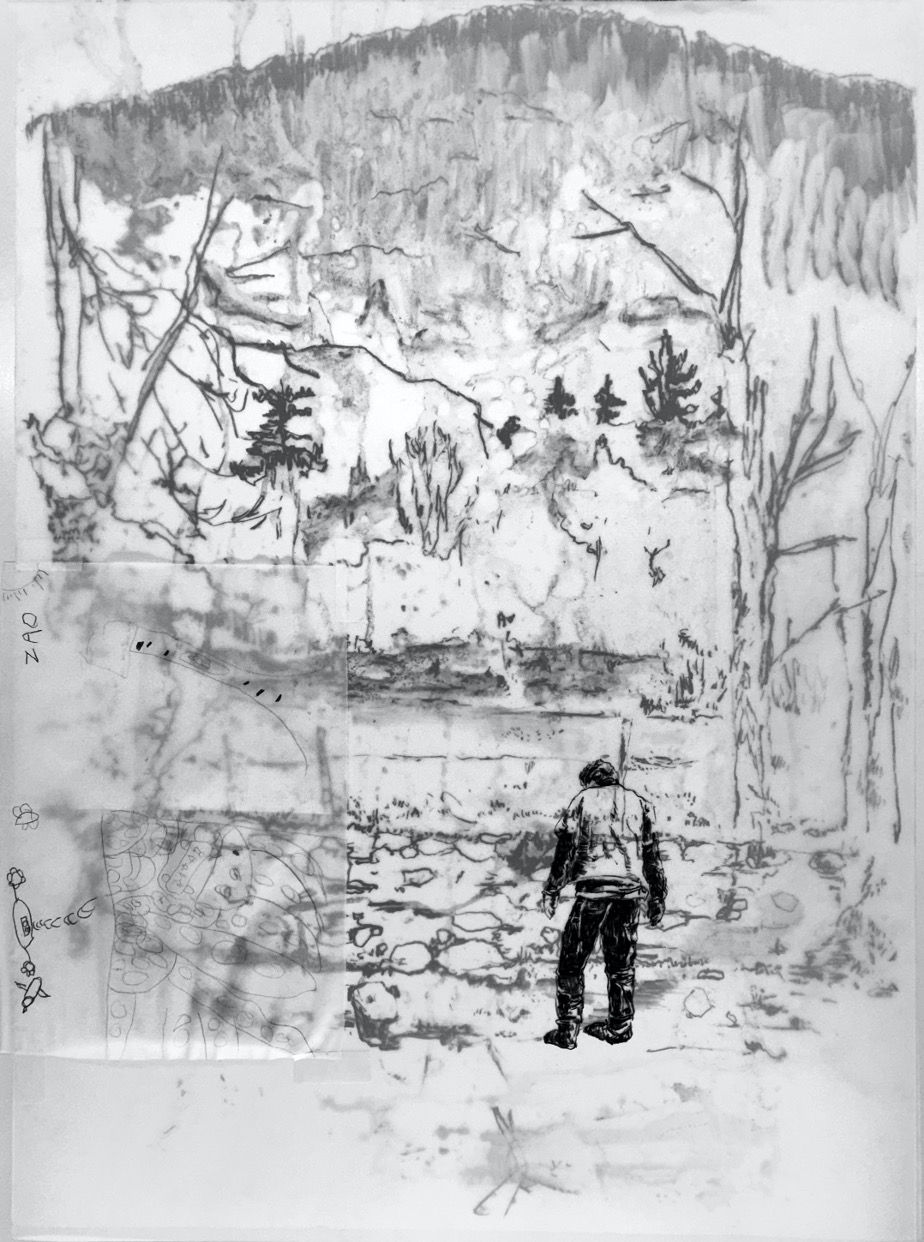 En dialogue avec la reconstruction artistique du muret en pierre sèche réalisée par Sandrine et Javier l’intervention au sol d’Helena Heras réunit ou étale la matière, selon le sens de la marche. Tel un pavé intermittent, la disposition des pierres suit une logique d’espacement dont la distance se dédouble, s’écartant au fur et à mesure que l’on s’éloigne des murets, donnant à la piêce un sens fonctionnel, nous dit Helena.